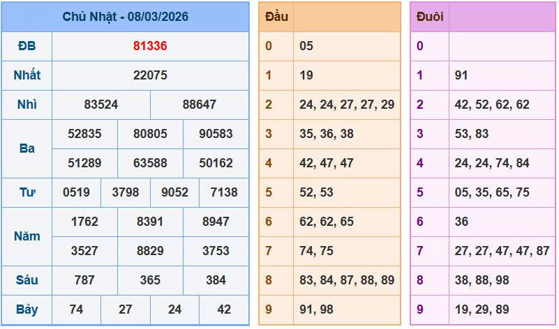 - Ví dụ thực tế: Dựa trên dữ liệu kỳ trước, Giải 4.2 có dạng 37983 (tổng hợp từ nhịp nén) không xuất hiện trực tiếp nhưng Giải 3.2 có dạng 80805 cho thấy nhịp kẹp 08 khá tiềm năng. Đặc biệt, Giải 4.4 có dạng 7138 (nhịp tiến) và Giải 2.1 có dạng 83524, sau khi soi xét nhịp đối xứng, anh em có thêm cơ sở cho cặp 35 – 53 trong phiên Soi cầu xsmb ngày 09-03-2026. Đây là dạng cầu thường báo hiệu sự xuất hiện của các bộ số có xác suất nổ lại khả quan.