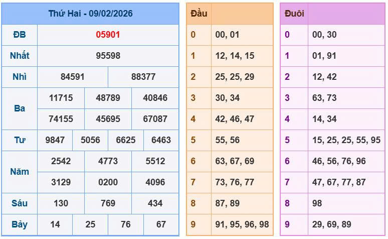 Phân tích thực chiến: Nhìn vào Giải Đặc Biệt hôm nay là 05901. Anh em thấy gì không? Cặp số 59 đang bị kẹp chặt giữa hai con số 0 (dạng 0 – 59 – 01). Đây là một dạng cầu kẹp cực kỳ mạnh mẽ và với soi cầu xsmb ngày 10-02-2026 đang sử dụng.