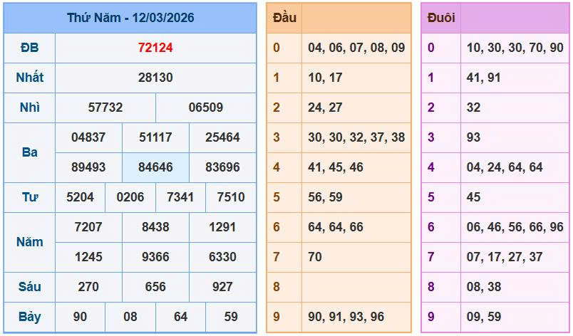 • Ví dụ thực tế: Quan sát bảng kết quả ngày 12-03, tại Giải Nhì 1 xuất hiện dạng 57732 (không có kẹp), tuy nhiên nhìn sang Giải 3.2 có dạng 51117 cho thấy cặp 11 đang bị kẹp. Đặc biệt tại Giải 5.1 xuất hiện dạng 7207, cặp 20 đang nằm trong vị trí kẹp cực đẹp. Kết hợp với Giải 3.4 là 84646 cho thấy cặp 46 – 64 đang có nhịp rơi rất sáng trong phiên Soi cầu xsmb ngày 13-03-2026.