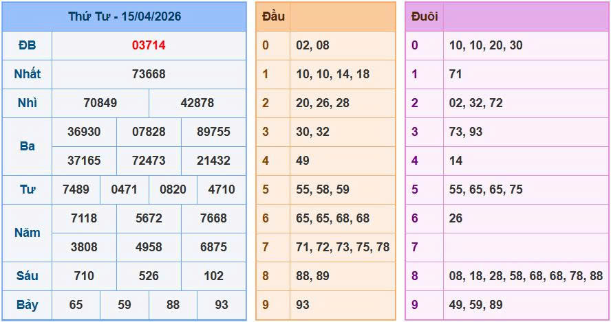 - Cách bắt: Dựa trên bảng kết quả ngày 15/04, Giải 3.2 xuất hiện dãy 07828 báo hiệu nhịp kẹp 78 đang cực kỳ nén và dễ nổ lại. Ngoài ra, Giải 4.3 xuất hiện dãy 0820 cho thấy nhịp kẹp 82 đang vào phom rất đẹp cho ngày Thứ Năm.