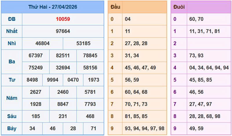 Quan sát bảng thưởng ngày 27/04, Giải 2.1 (46804) và Giải 2.2 (53185) tạo ra thế khuyết góc tại đầu 4-5 và đuôi 4-5. Đây là dấu hiệu cho thấy các cặp 45 – 54 hoặc 14 – 41 là những ứng viên giá trị để anh em cân nhắc đầu tư trong ngày Thứ Ba.